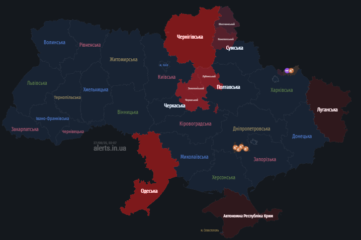 Уночі 27 серпня росіяни масовано атакували Суми безпілотниками. Внаслідок атаки у місті виникли перебої з електропостачанням, а також здійнялася пожежа.