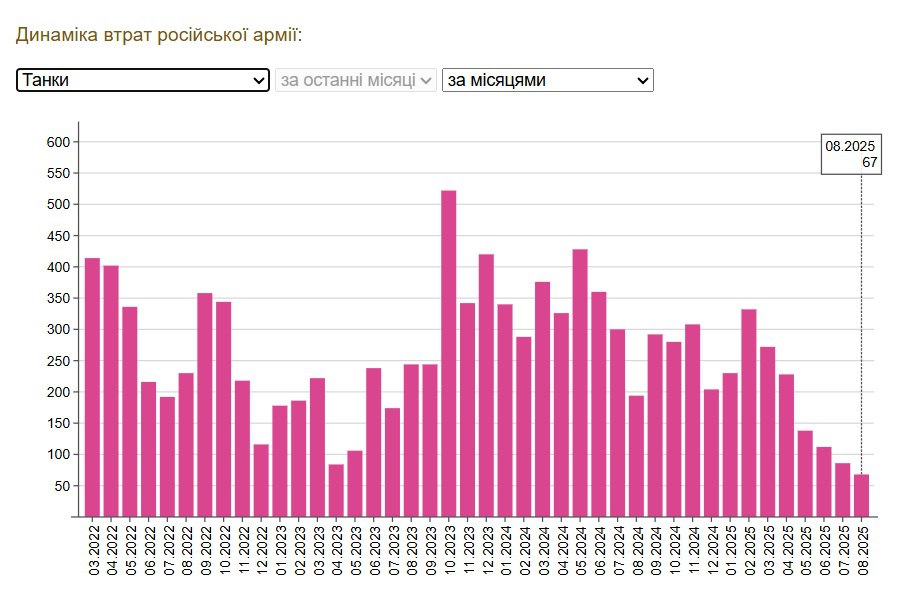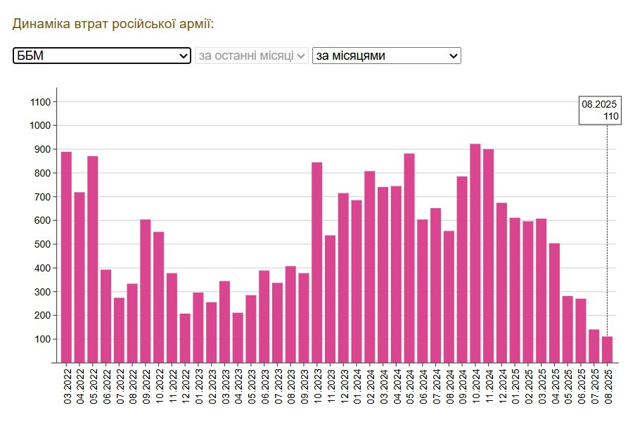 Втрати росіян у танках (ОБТ) і бойових броньованих машинах (ББМ) також показують вкрай низькі показники. Але це не результат збереження техніки, а показник її дефіциту — російська армія не в змозі компенсувати щомісячні втрати бронетехніки, тому застосовується жорстка "економія" машин, що залишилися.