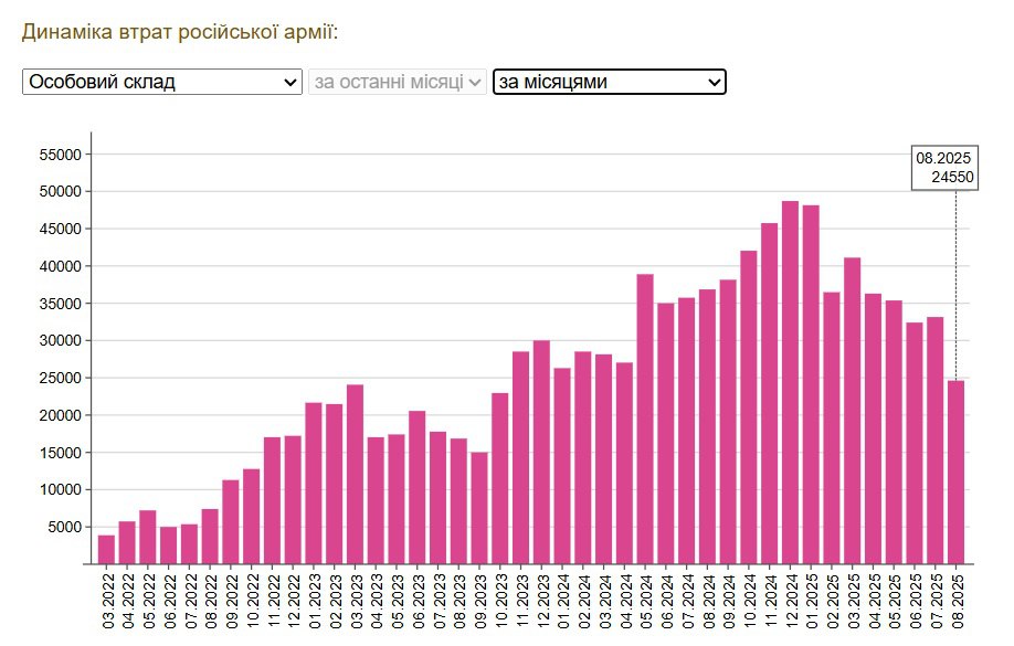 Серпень 2025 року може стати для російської армії місяцем із найменшими втратами особового складу з квітня минулого року. Орієнтовна цифра — 29-30 тисяч осіб.