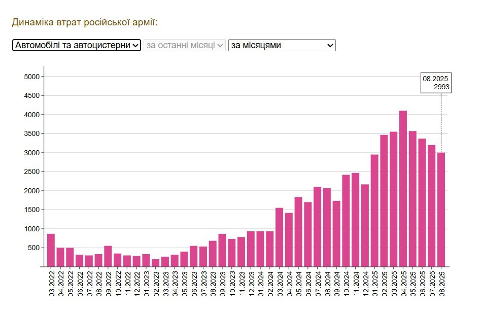 На тлі економії бронетехніки зростає роль автомобільного транспорту. Через це втрати вантажівок та іншої допоміжної техніки в серпні можуть увійти в ТОП-3 за весь час повномасштабного вторгнення.
