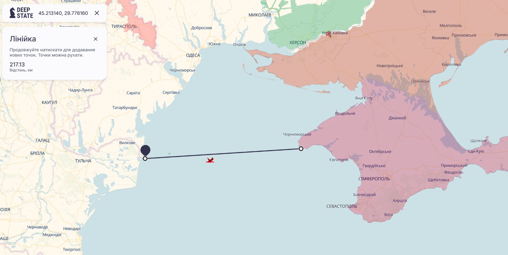 Росіяни не вказали, з якої саме точки стартували ударні безекіпажні морські катери. Орієнтовна відстань від гирла Дунаю до, умовно, мису Тарханкут на окупованому півострові Крим — близько 260 км.