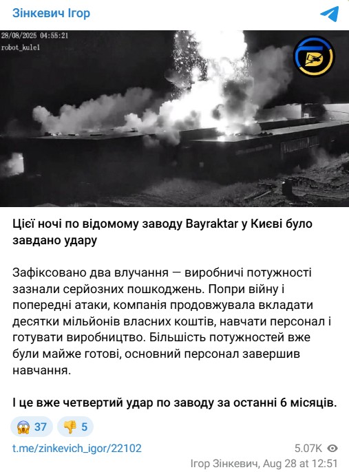 "Цієї ночі по відомому заводу Bayraktar у Києві було завдано удару. Зафіксовано два влучання — виробничі потужності зазнали серйозних пошкоджень", — написав Зінкевич.
