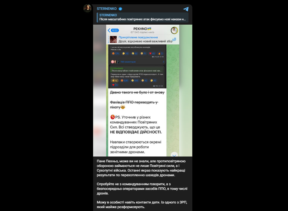 Зазначимо, що 29 серпня Сергій Стерненко оприлюднив у соцмережах пост, у якому заявив про появу нібито нових наказів щодо переведення фахівців протиповітряної оборони та операторів дронів-перехоплювачів у піхоту. За його словами, в один із підрозділів ППО передали перехоплювачі, але там уже не було достатньо людей, щоб ними працювати. Волонтер також підкреслив, що, на його думку, паралельно з повідомленнями про розбудову ППО фактично руйнується система, і це відбувається на тлі збільшення виробництва дронів-"шахедів".