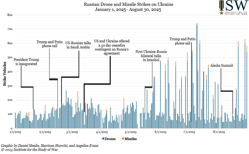 За оцінкою аналітиків, Росія під час підготовки до саміту на Алясці 15 серпня накопичувала безпілотники та ракети, одночасно завдаючи обмежені удари по Україні, щоб створити враження добросовісного учасника переговорів перед адміністрацією США.