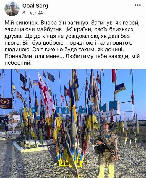 "Мій синочок. Вчора він загинув. Загинув, як герой, захищаючи майбутнє цієї країни, своїх близьких, друзів. Ще до кінця не усвідомлюю, як жити далі без нього. Він був доброю, порядною і талановитою людиною. Світ вже не буде таким, як донині. Принаймні для мене… Любитиму тебе завжди, мій небесний", — написав Сергій Голяченко.