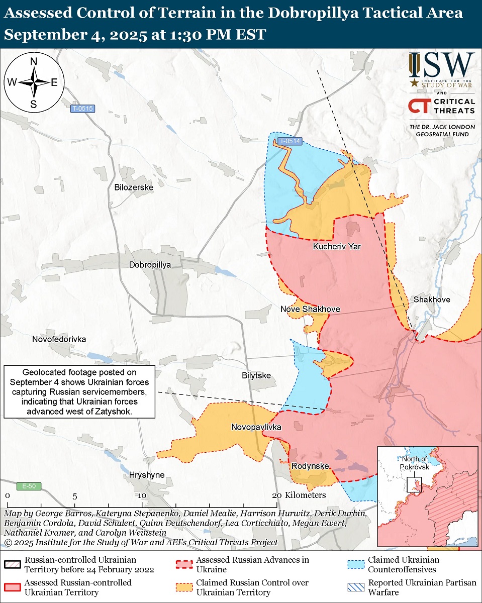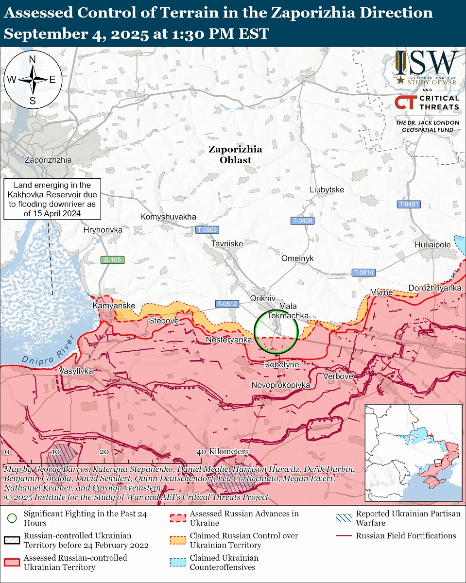 Тим часом геолоковані кадри, опубліковані 4 вересня, показують, як двоє російських військових піднімають прапор у Новоселівці (на схід від Великомихайлівки). ISW вважає, що цей населений пункт на Дніпропетровщині окупований.