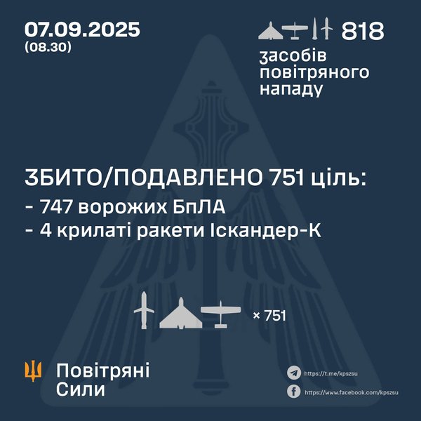 У ніч на 7 вересня російські війська завдали комбінованого удару по території України із застосуванням ударних БпЛА та ракет наземного базування.