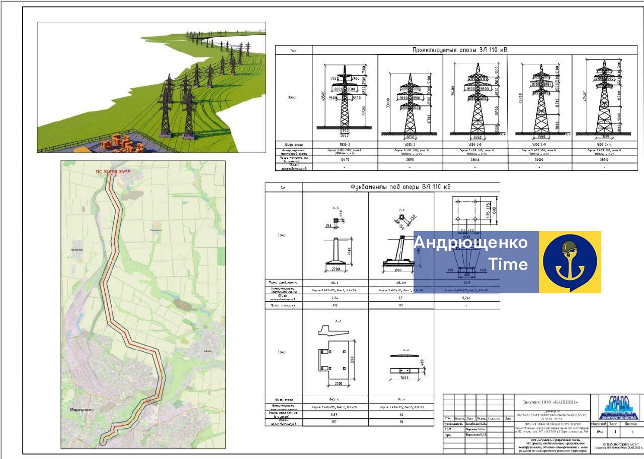 Андрющенко опублікував фрагмент документації, на підставі якої росіяни планують відновити електропостачання цехів на території заводу "Азовсталь". Зокрема, є орієнтовна схема, як ітиме ЛЕП, інформація про розміри та конфігурацію опор та фундаментів. Бачимо, що ідеться про відгалуження від ПС 380 кВ "Заря", яке не переходить далі берега Кальміусу.