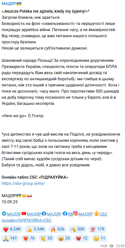 Наприкінець "Мадяр" процитував допис президента США Дональда Трампа про нічну атаку ЗС РФ на Польщу.