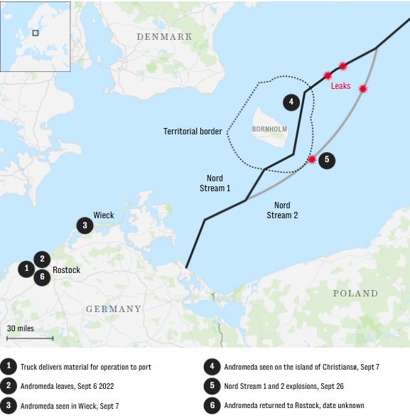 Для операції "Діаметр", як нібито прозвали підрив газопроводів у Балтійському морі, необхідно було провезти вибухові речовини контрабандою через кордон і закласти їх на 80-метровій глибині. У складі була одна з найкращих українських дайверок, і з жінкою в складі підрозділ виглядав як група відпочивальників, пише журналіст. За даними німецького слідства, "туристи" заклали бомби в чотирьох місцях біля данського півострова Борнхольм, і вони вибухнули за планом 26 вересня.