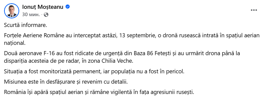 Також Моштяну наголосив, що ситуація перебувала під повним контролем, а безпека населення не була під загрозою. Він додав, що Румунія продовжує захищати свій повітряний простір і підтримує високу бойову готовність у відповідь на російські провокації.