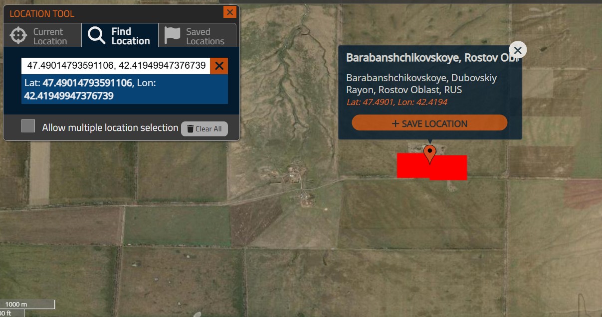 OSINTер вказав координати точки ураження — 47.49014793591106, 42.41949947376739. Якщо відшукати вказані координати на карті бойових дій DeepState, то бачимо, що засоби ураження України здолали майже 400 км: летіли над лінією фронту, над окупованими територіями РФ і їм не завадили російські засоби ППО.