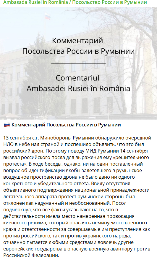 Посольство Росії в Румунії в офіційній заяві звинуватило Міністерство оборони Румунії в нібито поспішних висновках щодо вторгнення російського дрона 13 вересня. В російському відомстві заявили, що під час бесіди з російським послом в Міністерстві закордонних справ Румунії не дали "жодної конкретної та переконливої відповіді" на питання про ідентифікацію безпілотника.