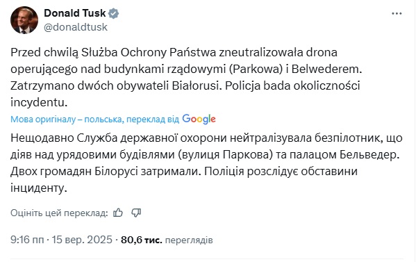"Служба державної охорони нейтралізувала безпілотник, який працював над урядовими будівлями (Парковим) і палацом Бельведер", — написав прем'єр-міністр Польщі в Х і додав, що затримано двох громадян Білорусі, а поліція розслідує обставини інциденту.
