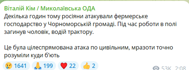 Пізно ввечері ворог атакував ударним дроном "Ланцет" фермерське господарство в Чорноморській громаді. Загинув 58-річний чоловік, який у той момент перебував у кабіні трактора, працюючи в полі. Пошкоджено сільгосптехніку та приміщення сусідньої ферми.