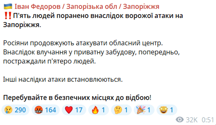 Про швидкісну ціль на Запоріжжя місцеві пабліки оголосили ще о 23:39, і вже за кілька хвилин стало відомо про приліт, а також про першого пораненого.
