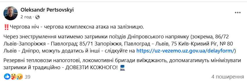 "Чергова ніч — чергова комплексна атака на залізницю. Через знеструмлення матимемо затримки поїздів Дніпровського напрямку", — написав Перцовський.