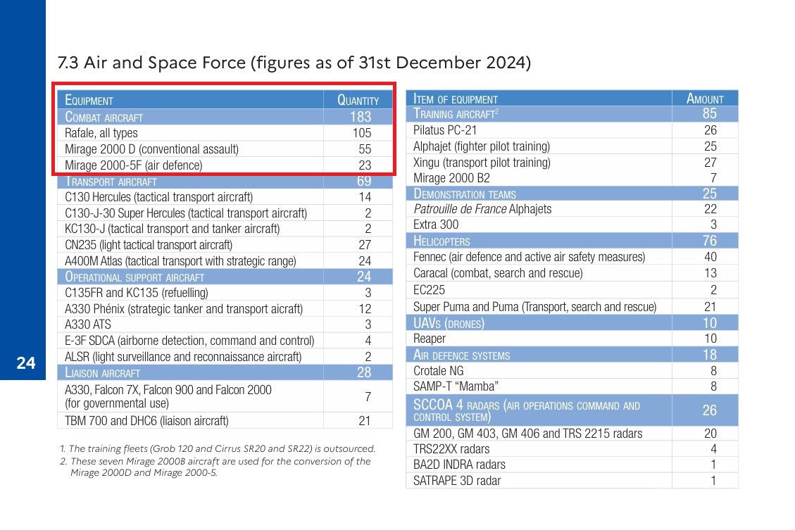 Аналітики порталу Defense Express звернули увагу на щорічний звіт Міністерства оборони Франції. Згідно з документом Chiffres clés de la défense 2025, на кінець 2024 року у французьких ВПС значилося 23 винищувачі Mirage 2000-5F, тоді як роком раніше їх було 28. Це вказує, що з бойового складу могли бути виведені лише п'ять літаків. Саме вони, на думку аналітиків, і могли бути передані Україні.