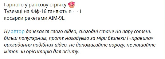 На відео з перехопленням "Шахеда" літаком F-16 відреагували у Telegram-каналі "Соняшник", який ведуть бійці Повітряних сил ЗСУ. У дописі, який з'явився зранку 19 вересня, вказано, що винищувач відпрацював ракетою AIM-9L. Також зауважують, що краще дотримуватись заходів безпеки і не лишати на відео міток, які допомагають OSINTерам росіян.