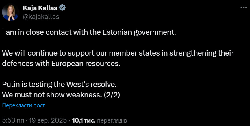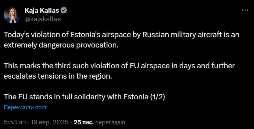На порушення повітряного простору Естонії також відреагувала голова дипломатії ЄС Кая Каллас. У своєму повідомленні в X вона зазначила, що сьогоднішнє вторгнення російських військових літаків є надзвичайно небезпечною провокацією.
