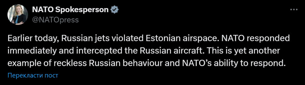 Окрім цього, на офіційній сторінці НАТО у соціальній мережі X повідомили, що сьогодні російські літаки порушили повітряний простір Естонії. Альянс негайно відреагував та перехопив російські винищувачі. У НАТО зазначили, що цей інцидент є черговим прикладом безрозсудної поведінки Росії та водночас демонструє здатність Альянсу швидко реагувати.