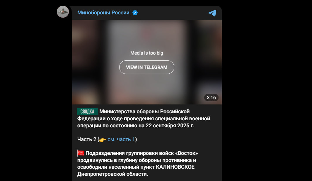 "Підрозділи угруповання військ "Схід" просунулися у глибину оборони супротивника та звільнили населений пункт Калинівське Дніпропетровської області", — йдеться в дописі Міністерства оборони РФ.