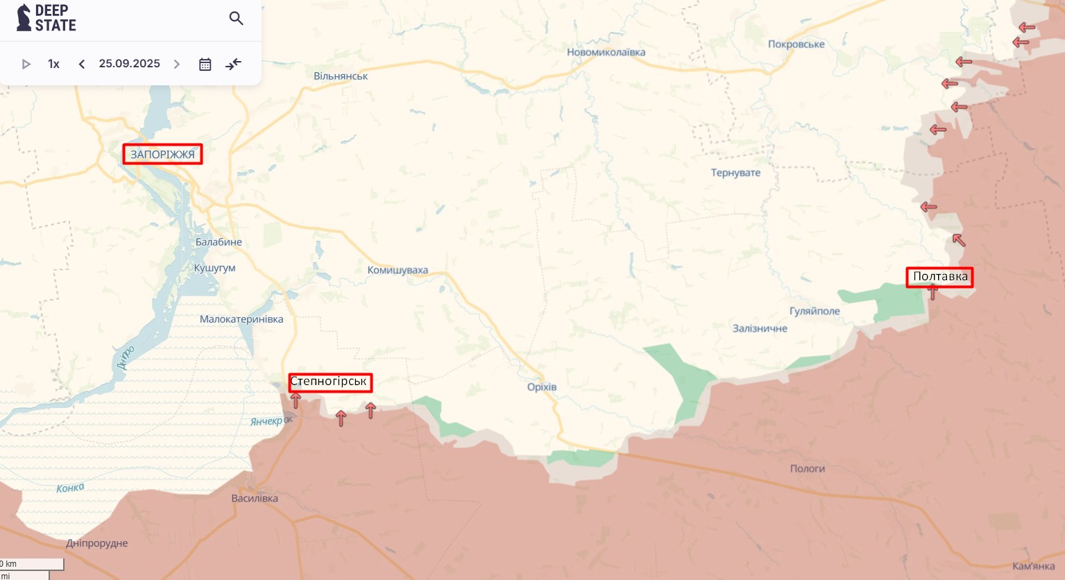 На карті бойових дій DeepState станом на 26 вересня показали 90-кілометрову лінію боїв на Запорізькому напрямку. Аналітики проєкту ще 30 липня позначили під Степногірськом, що ЗС РФ окупували Кам'янське, а з 28 серпня — контролюють три чверті Плавнів. У вересні DeepState показував розширення "сірої зони" на даному відтинку: інших змін не було. Тим часом поруч з Полтавкою 24-25 вересня зафіксували просування росіян на східних околиць населеного пункту: пройшли відстань близько 1 км. Український військовий позивним "Мучной" 25 вересня у Telegram-каналі написав, що під Полтавкою особливих змін поки немає, але ситуація загостриться, коли росіяни дійдуть до річки Янчур.