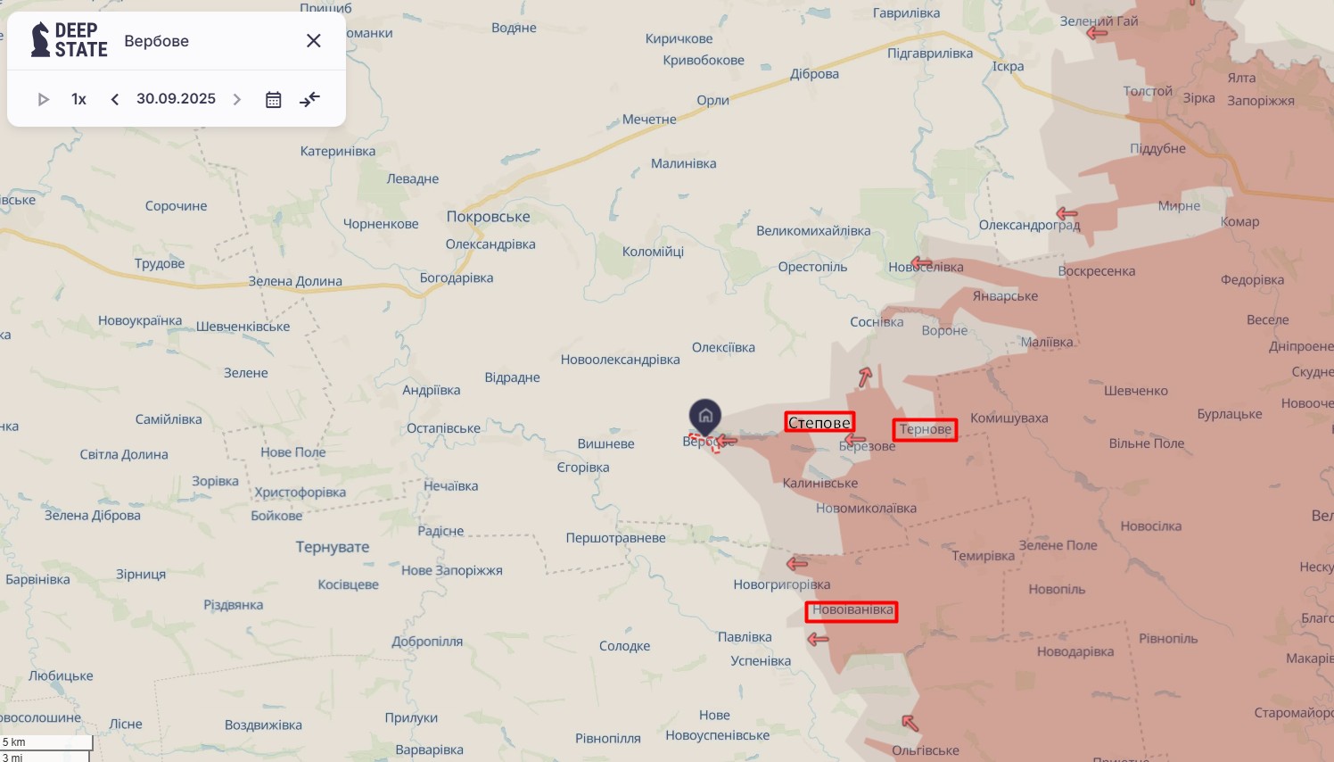 Дані аналітиків Deepstate показують, що тиждень тому, 24 вересня, росіяни були за 6 км від Вербового. Зміни на карті демонструють, як розповзається плацдарм ЗС РФ у Дніпропетровській області: 24 серпня — Запорізьке на адмінмежі, 24 вересня — "плюс" 5 км на захід у бік Калинівського, 1 жовтня — ще "плюс" 5–6 км до Вербового.