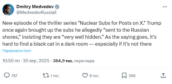 "Дональд Трамп знову говорить про підводні човни, які він перекинув "до узбережжя Росії", цього разу зазначаючи, що вони "абсолютно" невиявлювані", – зазначив Медведєв.