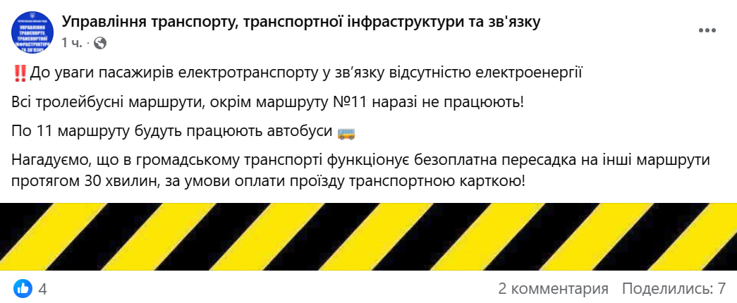 Окрім цього, Управління транспорту Чернігівської міської ради пише, що через відсутність електроенергії більшість тролейбусних маршрутів наразі не працює. Виняток — маршрут №11, де рух забезпечують автобуси. Пасажирам нагадують, що при оплаті транспортною карткою діє безоплатна пересадка на інші маршрути протягом 30 хвилин, що допомагає дістатися до потрібного місця навіть за обмеженого руху.