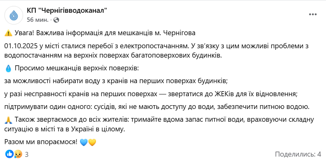 Публікація КП "Чернігівводоканал" у Facebook