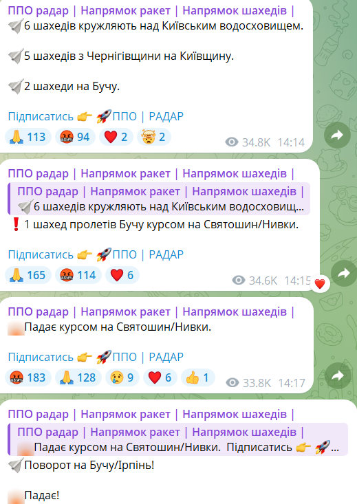 Моніторингові канали повідомляли про кілька запусків і подальших прильотів "Шахедів" у Бучі, Гостомелі та Ірпені. Спостерігачі зазначили, що шість дронів кружляли над Київським водосховищем, але потім змінили курс на Святошин і Нивки в Києві.