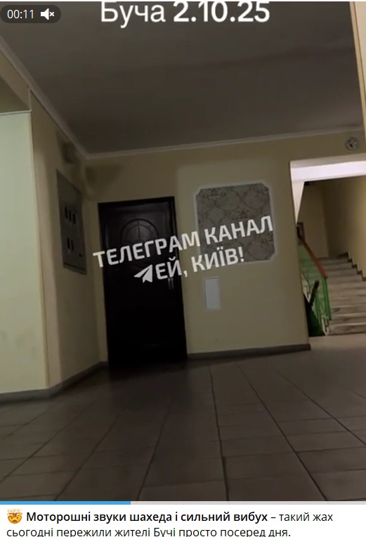 Один із "Шахедів" упав на подвір'ї приватного будинку в селі Озера Гостомельської селищної громади Бучанського району, але обійшлося без жертв і руйнувань, оскільки він не вибухнув. Відповідне відео опублікували низка пабліків, зокрема оприлюднив і журналіст Андрій Цаплієнко.