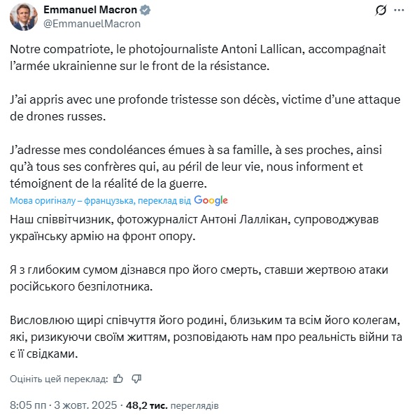 Президент Франції Емманюель Макрон висловив співчуття родині та близьким Антоні Лаллікана у пості на платформі X.