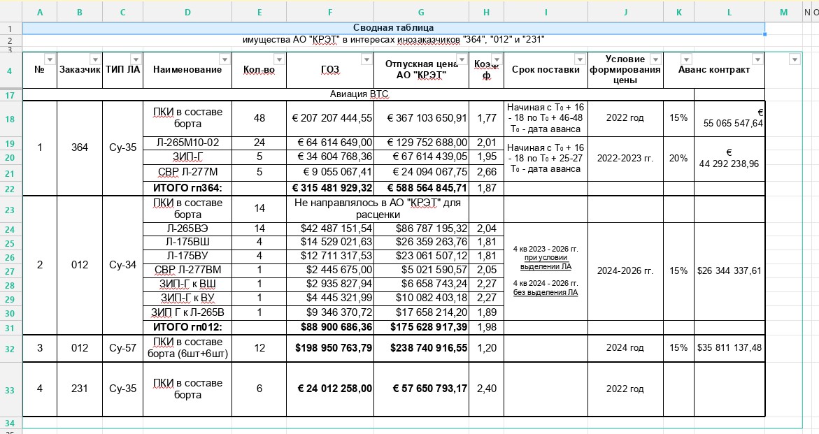 Одним із ключових елементів витоку стала таблиця контрактів дочірнього підприємства "Ростеха" — концерну КРЕТ (Концерн радіоелектронні технології). У ній вказані замовлення на постачання радіоелектронних систем для літаків Сухой, призначених для експорту. Клієнти позначені кодами: "364" — Іран, "012" — Алжир, "231" — Ефіопія: