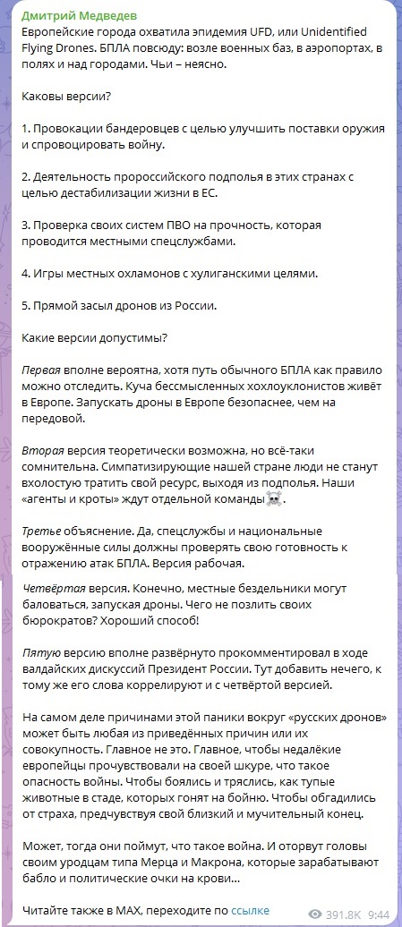 "Європейські міста охопила епідемія UFD, або Unidentified Flying Drones. БПЛА всюди: біля військових баз, в аеропортах, у полях і над містами. Чиї — незрозуміло", — заявив Дмитро Медведєв у своєму Telegram-каналі, зазначивши, що у нього п'ять версій того, що відбувається.