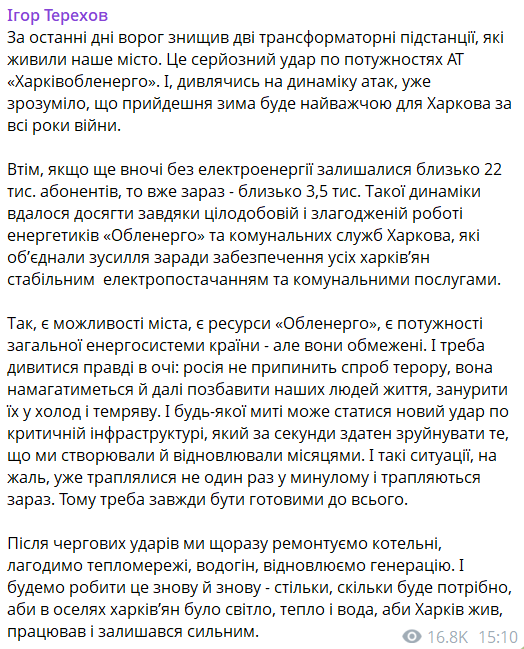 "І треба дивитися правді в очі: росія не припинить спроб терору, вона постарається і далі позбавити наших людей життя, занурити їх у холод і темряву. І в будь-який момент може статися новий удар по критичній інфраструктурі, який за секунди здатний зруйнувати те, що ми створювали і відновлювали місяцями. І такі ситуації, на жаль, уже траплялися не раз у минулому і трапляються зараз. Тому потрібно завжди бути готовими до всього", — попереджає Терехов.