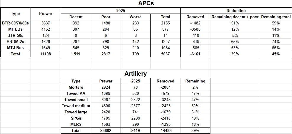 За підрахунками, на військових базах залишилося 39% від довоєнної кількості танків, 36% БМП, 45% бронетранспортерів і 39% артилерії. Jompy зазначає, що за останні шість місяців росіяни витягли зі зберігання всі БМП, які можна було використовувати. А ті, що залишилися, мабуть, перебувають у неробочому стані.