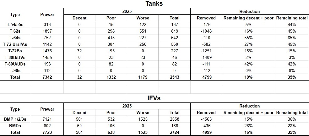 Дослідник також припустив, що у росіян залишилося не так багато бронетехніки, яку можна визначити як таку, що перебуває в нормальному стані, танків у цій категорії не залишилося і зовсім.