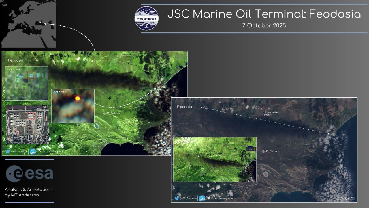 Також OSINT-дослідник М.Т. Андерсон опублікував супутникові знімки нафтобази в окупованій Феодосії.
