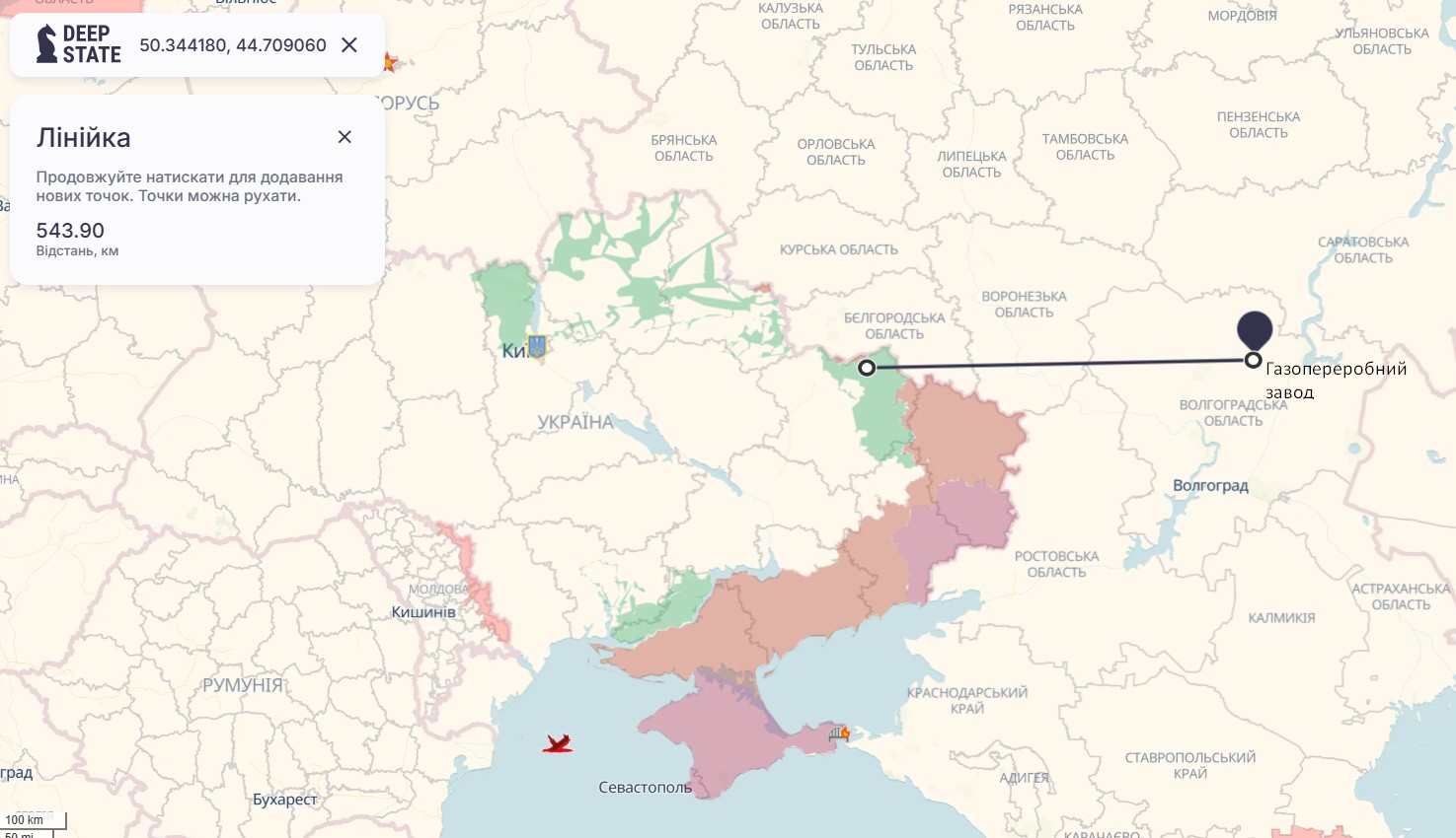 На карті проєкту DeepState можна відшукати точку, по якій вдарили deep-strike ССО. Бачимо, що ймовірна відстань до цілей — близько 500 км. При цьому невказані засоби ураження, якби рухались по прямій, мали б проминути засоби ППО, як мінімум, Бєлгородської, Воронезької та Волгоградської областей РФ.