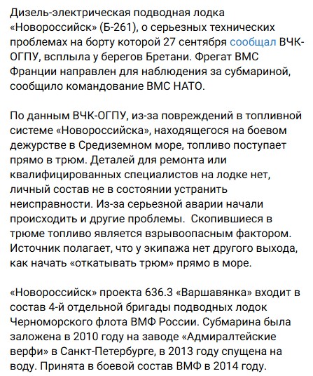Про можливу причину інциденту із субмариною РФ написали у російському Telegram-каналі ВЧК-ОГПУ. Вказується, що ідеться саме про "Новоросійськ". Також називають можливу причину виринання: проблеми з витоком палива, яке виливається в трюм. Подібні поломки неможливо відремонтувати під водою, тому слід негайно прибути на завод. Вперше про негаразди з цим підводним човном стало відомо 27 вересня: витік почався під час бойового патрулювання у Середземному морі. Оскільки ні обладнання, ні фахівців на борту немає, то почалось накопичення вибухонебезпечних речовин. На думку співрозмовника каналу, щоб не допустити вибуху, моряки мають вдатись до крайніх засобів: почати викачувати паливо просто в море.