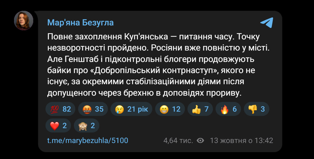Як стало відомо з її публікації в Telegram, точку незворотності вже пройдено — російські війська повністю перебувають у Куп’янську. Безугла додала, що "Добропільський контрнаступ" існує лише в повідомленнях, а насправді відбуваються окремі стабілізаційні дії після прориву через неточності в доповідях.