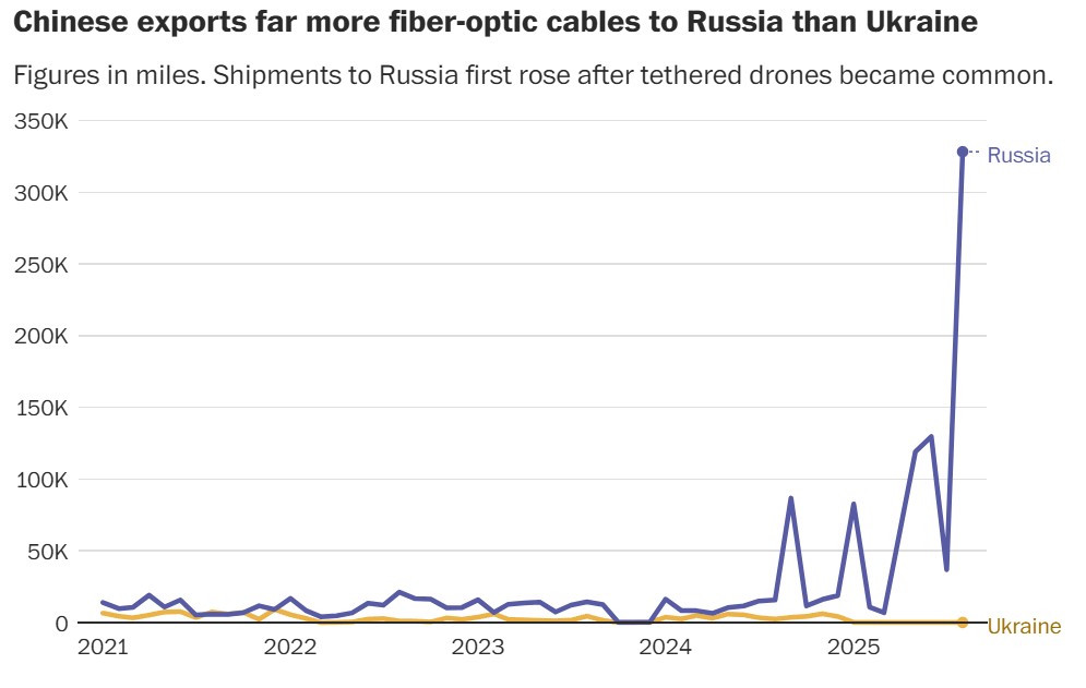 Китай надав Росії істотну допомогу в отриманні технологічної переваги у війні проти України, різко збільшивши влітку експорт ключових компонентів, що використовуються при виробництві оптоволоконних безпілотників.