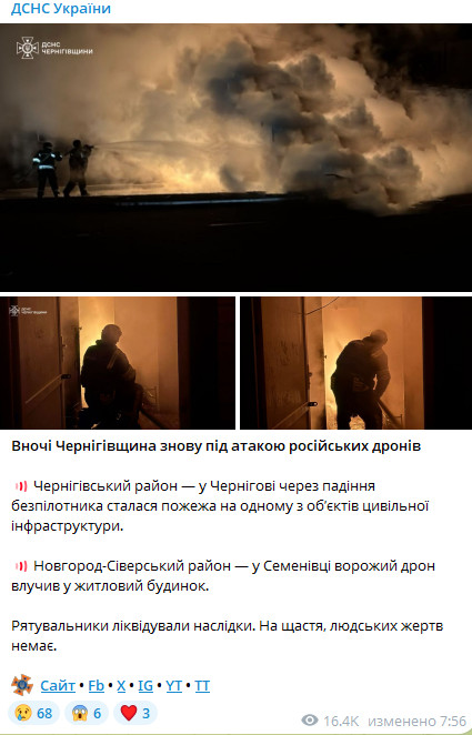 Ворожі дрони також атакували Чернігівську область. Як повідомили у Державній службі з надзвичайних ситуацій, у Чернігові через падіння безпілотника сталася пожежа на одному з об’єктів цивільної інфраструктури, а в Семенівці Новгород-Сіверського району дрон влучив у житловий будинок.