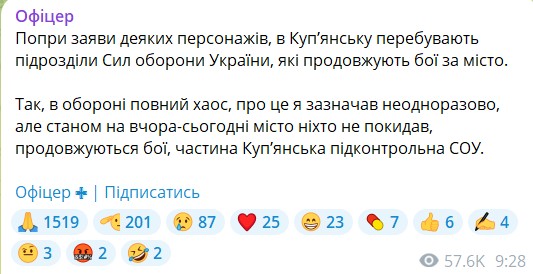 Інформація про захоплення росіянами Куп'янська не відповідає дійсності, написав військовослужбовець ЗСУ з позивним "Алекс" у Telegram-каналі "Офіцер". У місті перебувають бійці Сил оборони та продовжуються бої.