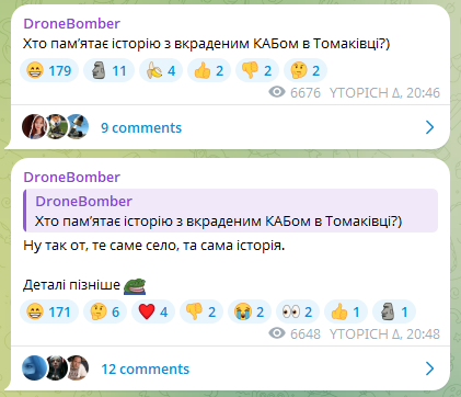 "Хто памʼятає історію з вкраденим КАБом в Томаківці? Ну так-от, те саме село, та сама історія", — йдеться у повідомленні.