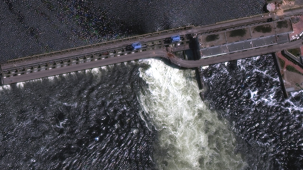 Гребля Каховської ГЕС втримували 18 млрд куб. м води Каховського моря, яке через отвір у греблі понеслось вниз по річищу Дніпра. На фото з місця подій бачимо білий вир, який рветься через діру у дамбі, руйнуючи сусідні бетонні ділянки та затоплюючи прибережні населені пункти.