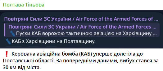 Місцеві пабліки уточнюють, що російський КАБ упав за 30 кілометрів від обласного центру. Моніторингові канали припускають, що пуск авіабомби було здійснено з території Бєлгородської області.