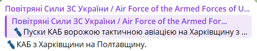 Авіабомба була запущена тактичною авіацією на Харківську область із півночі, проте долетіла до Полтавської, повідомили в Повітряних силах ЗСУ.